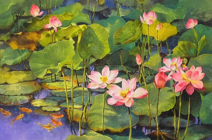 “Về Ngộ” cũng gồm nhiều bức tranh tĩnh vật, khắc họa vẻ đẹp của hoa đào, hoa hướng dương, cành hồng, đặc biệt là hoa sen. Theo hoạ sĩ, mỗi cành hoa đều mang vẻ đẹp tự nhiên và đều có tính Phật. Đặc biệt, hoa sen là một biểu tượng của Phật giáo, mang vẻ đẹp thanh tịnh, biểu trưng cho phẩm chất cao quý của con người. “Ngắm nhìn một bông hoa để hiểu rõ tính Vô thường mà Đức Phật nói đến. Vì biết bông hoa kia nay còn mai mất, nên sẽ giúp ta sống chánh niệm với từng giây phút hiện tại”– Hoạ sĩ chia sẻ.